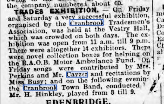 I found your details on the Cranbrook Town Band website. I came across the website while researching my family tree: my great grandfather lived in Cranbrook in the 1920’s. There’s a picture on your website archive homepage which I believe includes my great grandfather, though I believe his name has been wrongly transcribed as Stan Hayes (Now corrected) (his name was Archibald Stanley Cayzer, but seems to have used the name Stan/Stanley – the Parish Life magazine published this photo in 2017 but referenced him as H S Cayzer).